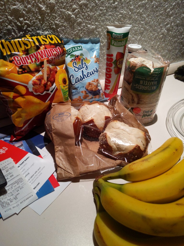 In Dortmund, I walked way too far in the rain to the Real for breakfast bananas and “nature waffles” (rice cakes), hazelnut spread in a tube, Weihnachten cards, nice malty beer, and marzipan potatoes. And then I quickly learned how to open a beer bottle without a bottle opener on hand. In Frankfurt, we discovered our first ebbelwoi (apple wine), which we chilled in a bathroom sink full of cool water.